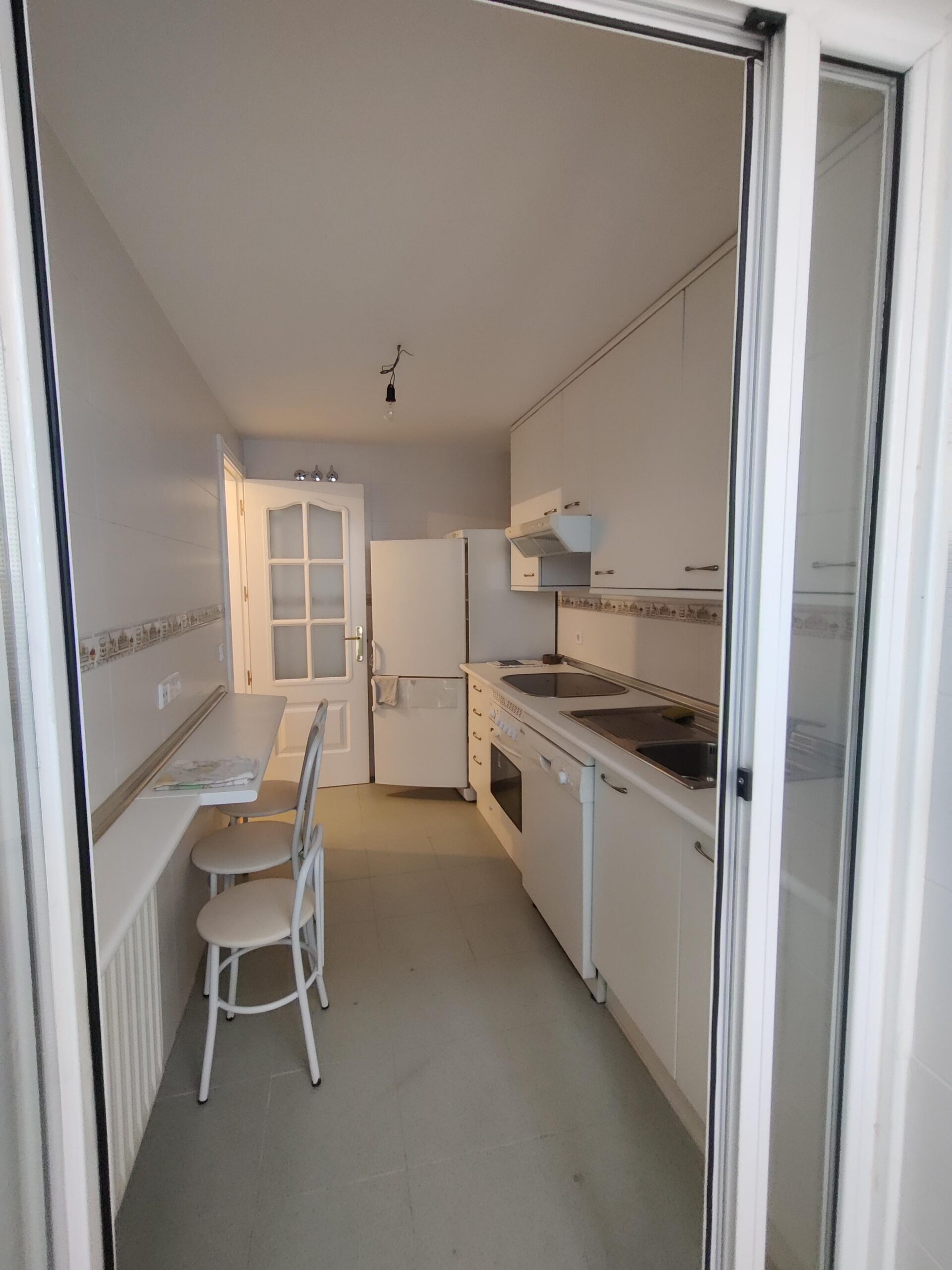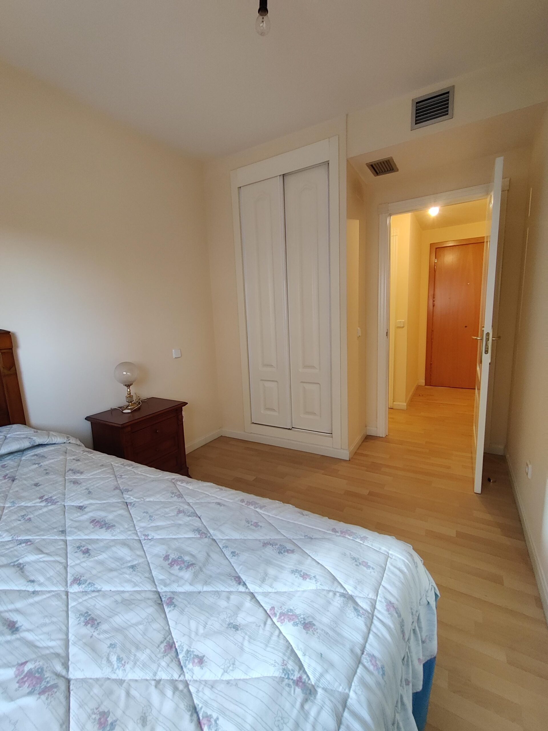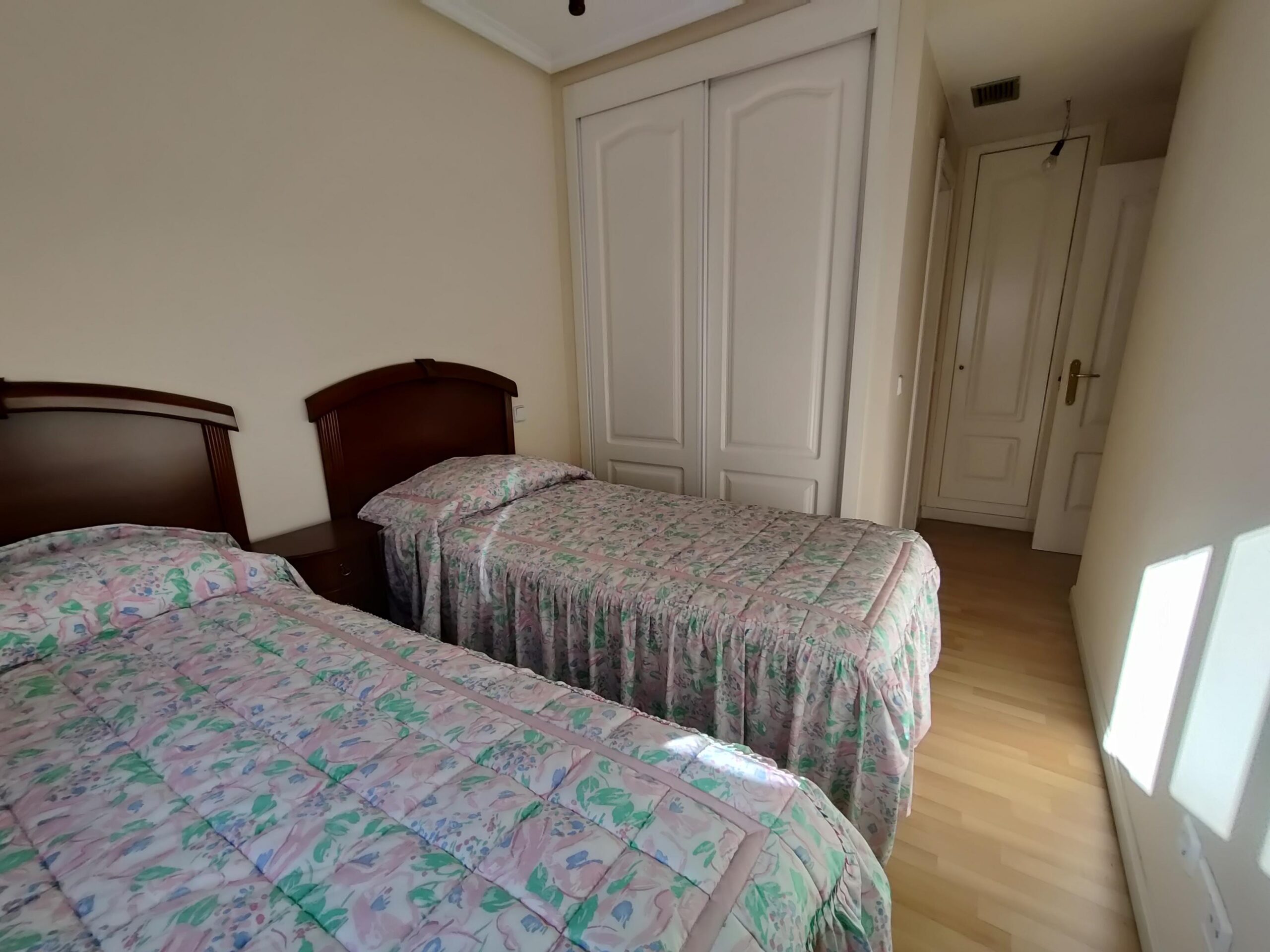 El interior de la vivienda destaca por su buen estado de conservación y acabados de calidad. Los suelos de tarima de roble y la carpintería lacada en blanco aportan luminosidad y elegancia. El salón-comedor, con su amplio ventanal, dos habitaciones dobles, equipadas con armarios empotrados, y dos baños completos aseguran comodidad para todos.